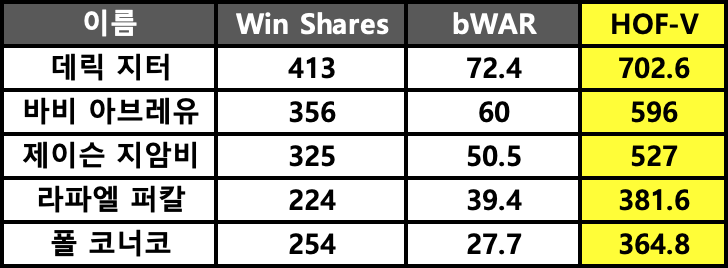 현시점에서 이들의 구체적인 승패 기록을 확인하는 것은 불가능하다. 제임스가 HOF-V의 적용 대상인 985명의 명단을 전부 공개하지 않았기 때문이다. 하지만 이들 중 지터와 아브레유, 지암비는 커트라인인 500을 넉넉히 초과하는 HOF-V를 기록하고 있다. 특히 지터가 기록한 702.6의 HOF-V는 지난 2015년 82.7%의 득표율로 명예의 전당에 입성한 크레이그 비지오(690)보다도 높은 수치다.