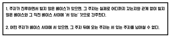그리고 포스 주자에 하나만 더 끼워 넣도록 하자. 타자주자는 누구에게 떠밀리는 건 아니지만 타격 직후 1루로 달려가야만 한다. 강제로 다음 루로 가야 한다는 점에서는 포스 상태에 놓인 주자와 마찬가지이므로 홈~1루 사이를 달리는 타자주자가 포스 상태에 놓였다고 해도 큰 문제는 없어 보인다. 따라서 홈~1루 사이를 달리는 타자주자도 포스 주자에 포함시킨다.