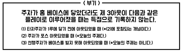 [해설2] 제3아웃은 1루 주자의 늦은 리터치에 따른 아웃이다. [문제1]에서 본 것처럼 이 아웃은 포스 아웃이 아니다. 따라서 2루 주자의 홈인은 인정된다. 2루 주자가 리터치를 않았는데 득점이 인정되는 게 뭔가 이상하게 느껴지는가? 그렇지만 분명히 득점이 맞다.