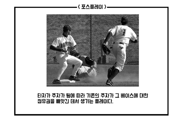 2. 포스 아웃인지 아닌지를 결정짓는 건 주자에 대한 태그 여부가 아니라 주자가 놓인 상황이다. 포스 상태에 놓인 주자가 아웃되면 그것이 포스 아웃이다.