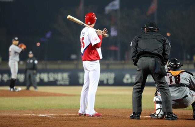 하지만 기아 김기태 감독의 생각은 다른 모양이었다. 김 감독은 정우람이 투입되자 투수 문경찬을 대타로 투입했다. 불펜에 있던 문경찬은 헬멧을 쓰고 타석에 들어섰다. 결과는 삼구 삼진이었다.
