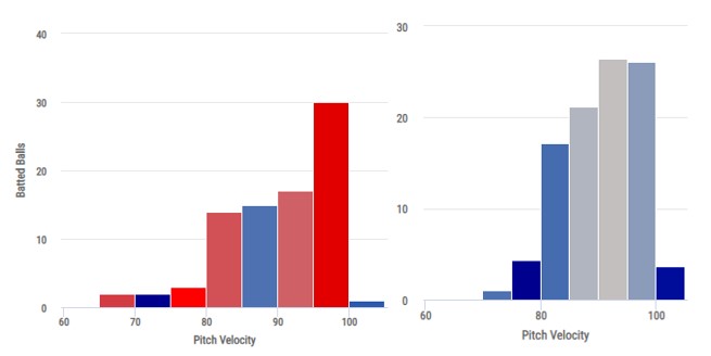 하이 패스트볼(빨간색)과 낮은 변화구(파란색)에 각각 해당되는 코스