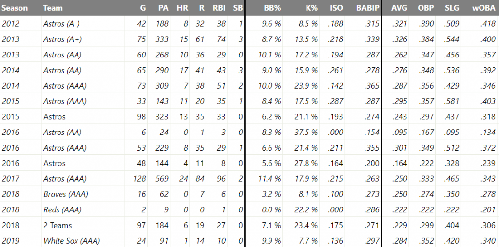 마이너리그 통산 성적 577경기 0.281/0.352/0.484 101홈런