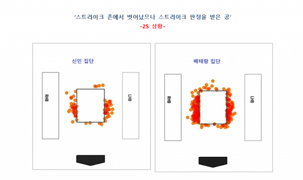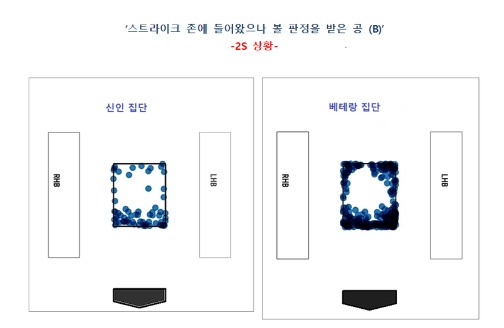 2S 상황 또한 큰 차이는 없었다. 여기서 알 수 있는 것은 투 스트라이크 상황일 때 존의 좌우 판정이 후해진다는 것 정도다. 마지막으로 2S 상황에서 신인과 베테랑의 B를 비교해 보자.