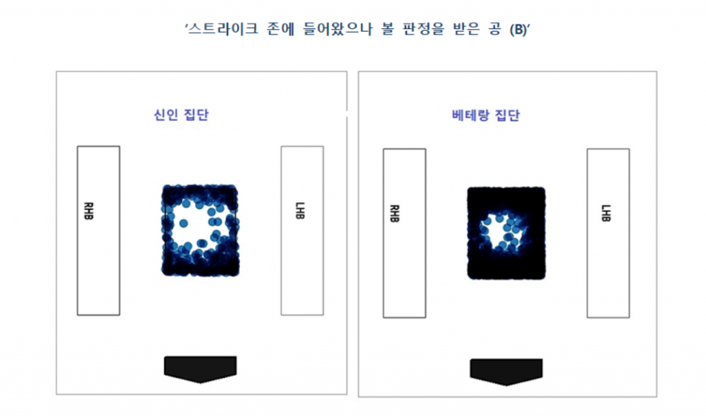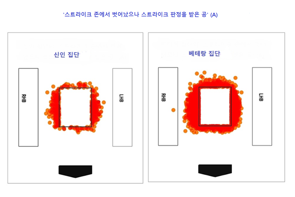 마찬가지로 이미지로는 큰 차이를 알기 힘들었다. 다만 A보다 색이 다소 진하고, 베테랑의 B가 신인보다 많아 보인다. 심지어 우측 그림에선 스트라이크 존 한복판에 들어왔는데도 볼 판정을 받은 공도 몇 개 있다. 설마 베테랑이 손해를 본 걸까?