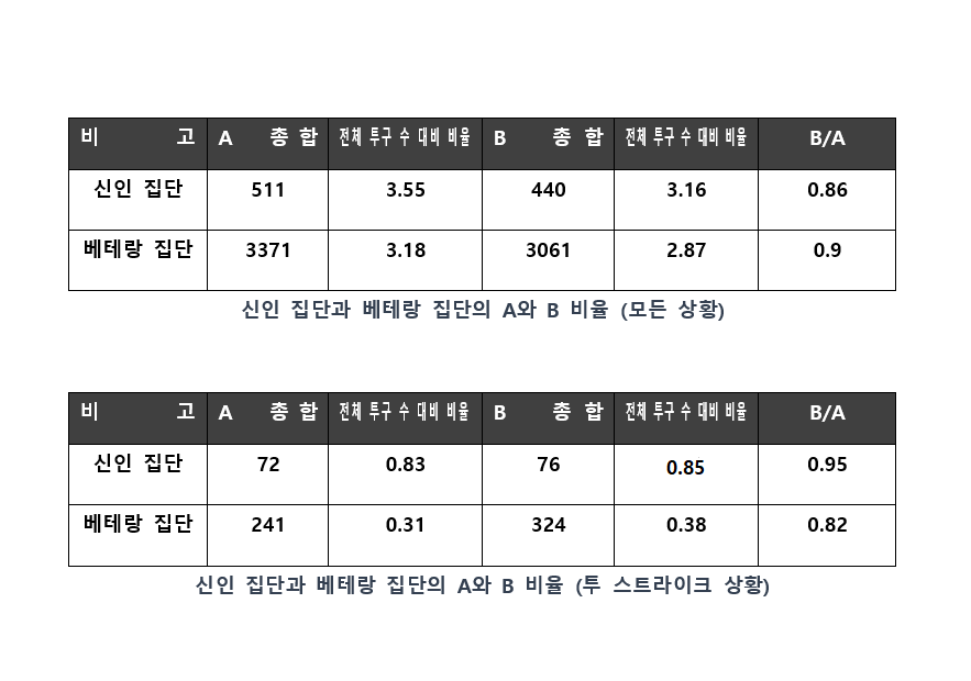 하지만 이 추측도 착각이었다. 전체 투구에서 B의 비중은 신인이 3.16, 베테랑이 2.87로 오히려 B도 신인이 더 많은 편이었다.