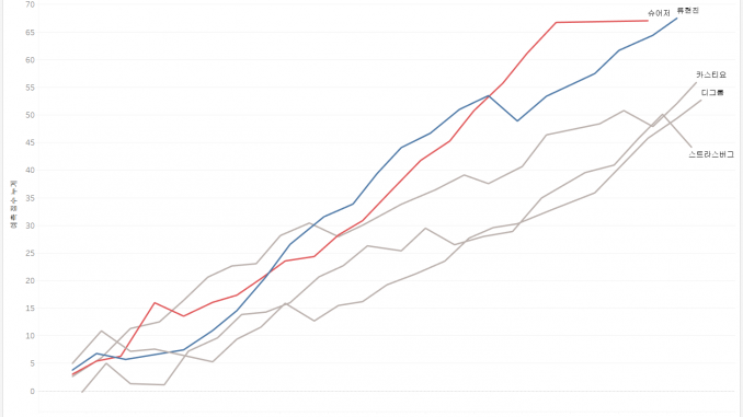 사이영 상 수상자는 미국 야구 기자 협회의 투표로 결정되는데, 대표적인 세이버메트리션 톰 탱고는 이들의 투표 성향을 분석해 사이영 상 예측 점수를 만들었다. 여기서도 류현진과 슈어저는 엎치락뒤치락을 반복하며 이번 시즌 또다른 화제 거리를 선사해 주고 있다. 하지만 누가 사이영 상을 타게 될지 예측하는 것은 이 글에서 다루고자 하는 소재가 아니다. 아직 시즌은 많이 남았고, 변수도 많다. 두 선수 모두 건강히 멋진 레이스를 보여주길 바란다. 류현진이 2등을 하게 되면 뭐 어떤가. 2등이 부끄러운가?