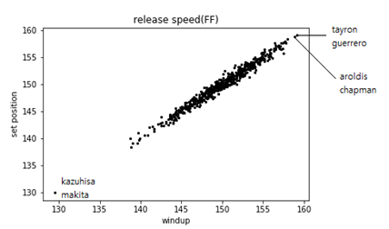 위 산점도는 선수별로 와인드업과 스트레치 포지션에서의 구속(km/h)을 표시한 것으로, 어느 한쪽이 일관되게 높거나 낮은 양상은 없었다. 포심의 구속에 대해서만 표시했지만 다른 항목도 마찬가지였다. 최소한 일반적으로 나타나는 구위 측면에서는 이렇다 할 차이가 없음을 알 수 있다.