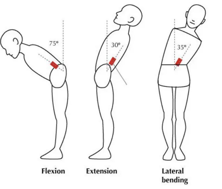요추(허리)에서는 허리를 뒤쪽으로 젖히는 신전(폄, Extension), 앞으로 굽히는 굴곡(굽힘, Flexion), 옆으로 굽히는 측굴(가쪽 굽힘, Lateral bending)이 발생한다.