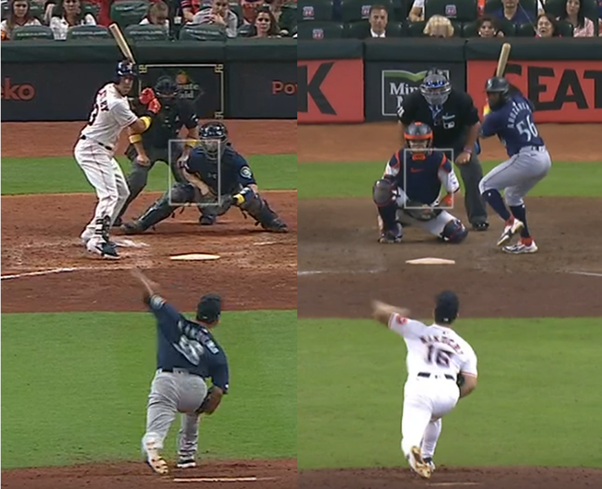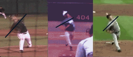 < 각기 다른 팔 각도를 가진 투수들의 투구 모습. 양 어깨를 이은 선 상에 팔꿈치가 위치하며 팔이 앞으로 가속하고 있다. >