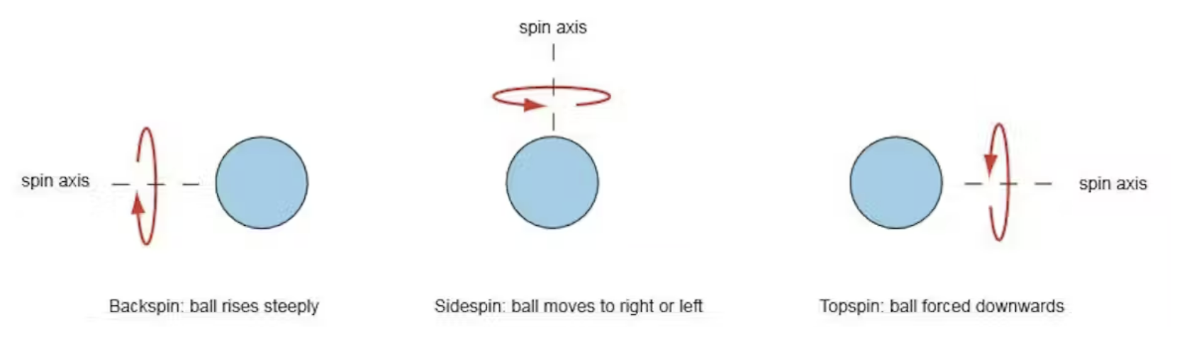 순수한 백스핀이 걸린 공에서는 회전 방향이 이동 방향과 반대이고, 순수한 탑스핀이 걸린 공에서는 공의 이동 방향과 동일하다. 순수한 사이드 스핀이 걸린 공에서는 이동 방향과 수직이다.