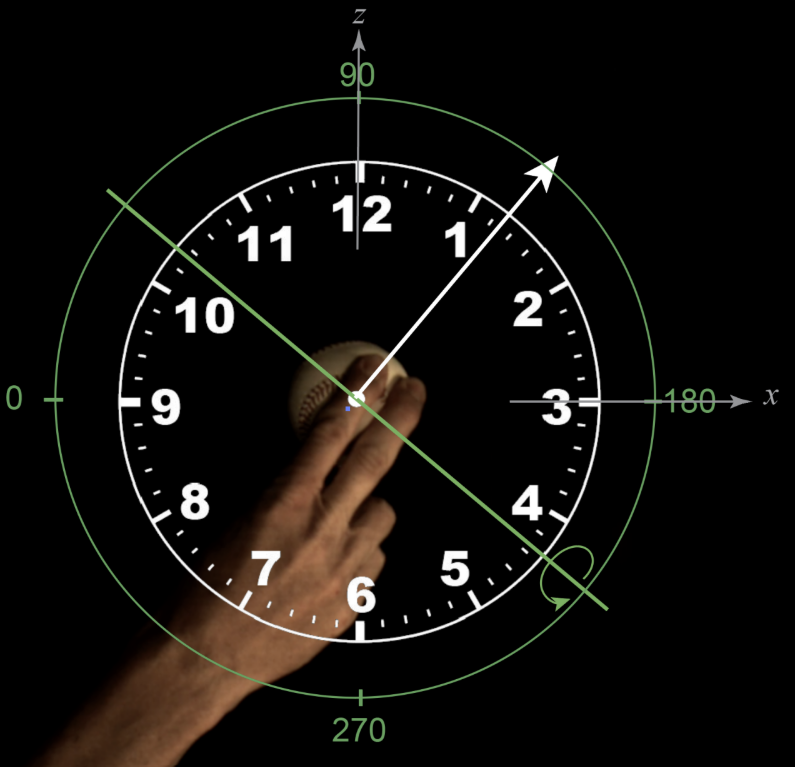 < 쓰리쿼터 투수의 포심에 걸리는 백스핀의 회전축(초록색 직선)과 양력이 공에 힘을 가하는 방향(하얀색 화살표). 회전축이 지면에 대해 기울어져서 양력이 공을 비스듬하게 들어 올린다. >