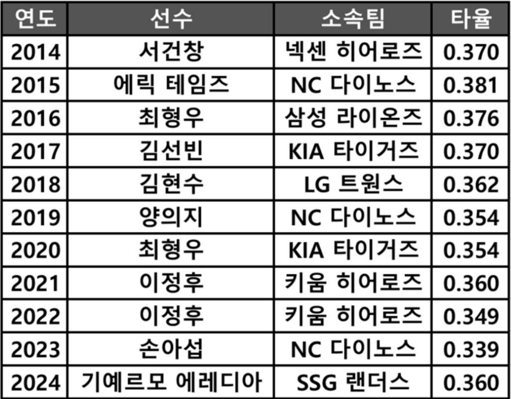 < 표1. 2014년부터 2024년까지 수위타자 타이틀을 차지한 선수들의 타율 >