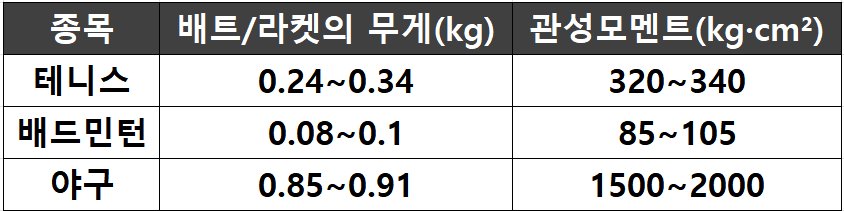 < 표3. 스포츠  종목별 배트/라켓의 무게, 관성 모멘트 >