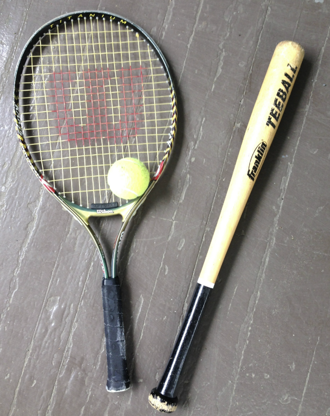 < 테니스 라켓(왼쪽)과 야구 배트(오른쪽)의 모습. 야구 배트는 손잡이에서 멀리 떨어진 부분에 무게 분포가 집중되어 있어 관성 모멘트가 매우 크다 >
