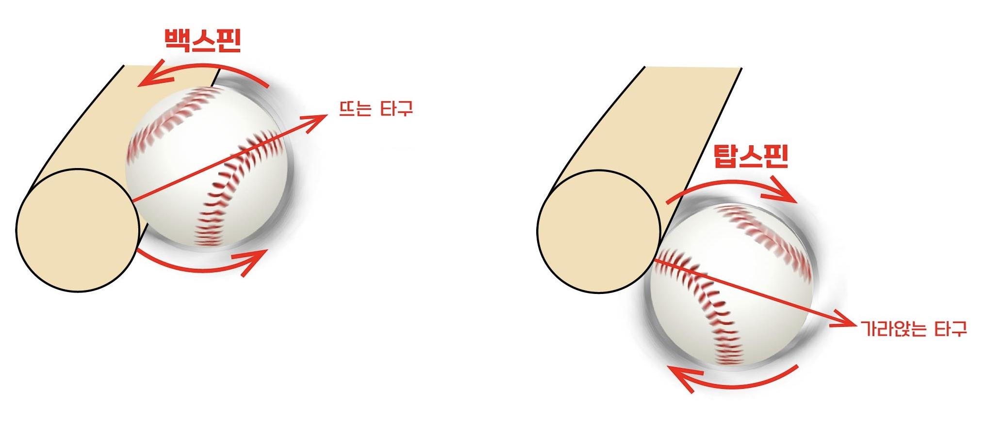 < 야구공이 배트와 맞는 지점에 따라 타구의 방향과 공에 걸리는 스핀이 달라진다. 공의 밑동이 배트와 맞으면(왼쪽) 공에 백스핀*이 걸리며 지면에서 뜨는 타구가, 공의 윗부분이 맞으면(오른쪽) 탑스핀*이 걸리며 가라앉는 타구가 형성된다. >