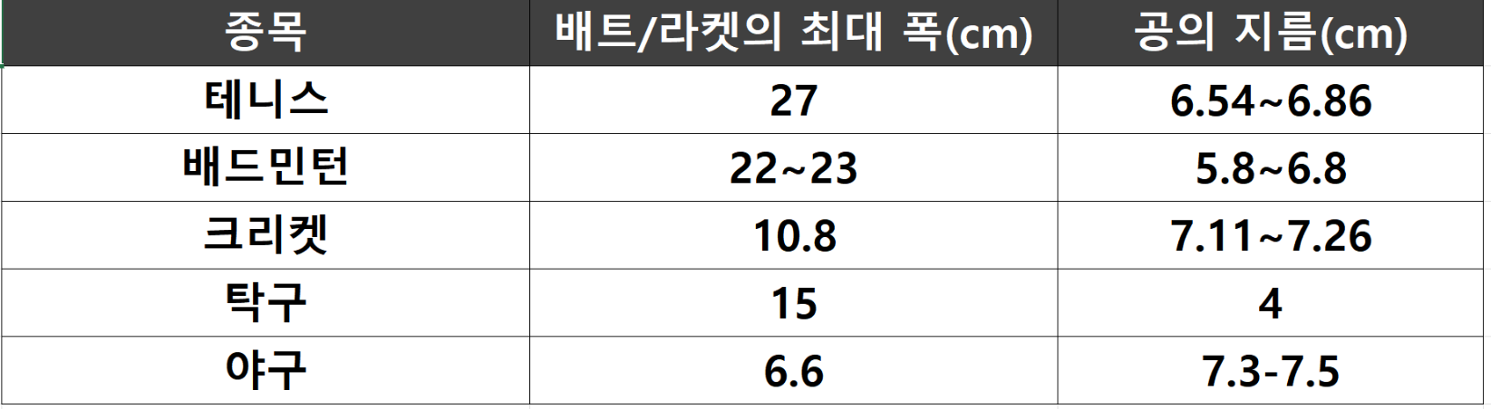 < 표2. 종목별 배트의 폭과 공의 지름 >