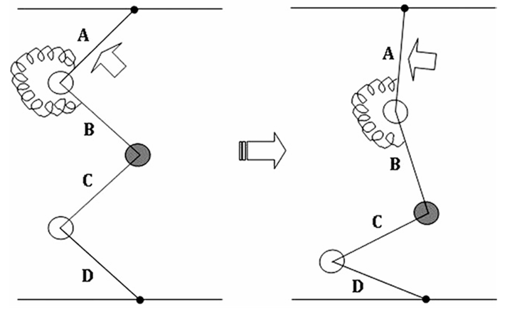 < 프란츠 뢰로가 설명한 강체 연결 시스템에서 물체가 힘을 받을 때 움직이는 양상. A가 힘을 받을 때 B, C, D도 운동한다. >