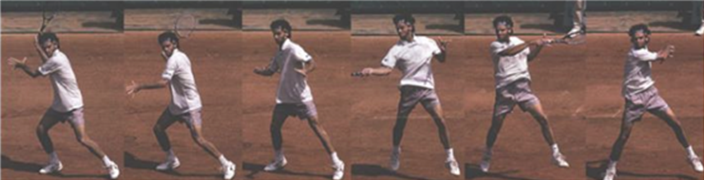 < 테니스 선수가 포핸드 스트로크를 구사하는 모습과 그 과정에서 신체 부위의 속도를 시간에 따라 나타낸 것. 다리, 골반, 몸통, 위팔, 아래팔이 순차적으로 움직이며 점점 더 빠른 최고속도가 나타난다. >