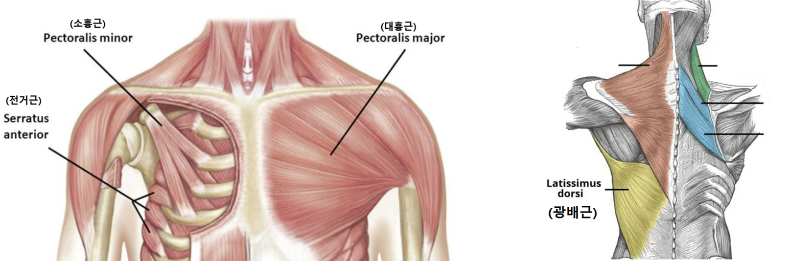 < 어깨가 내회전할 때 주로 사용되는 가슴 근육(왼쪽)과 등 근육(오른쪽) >