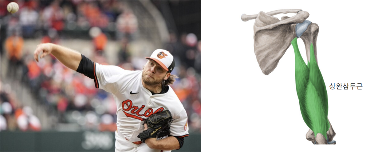 < 팔꿈치가 빠르게 펴지며 손목이 몸 안쪽으로 회전하는 모습(왼쪽)과 팔꿈치가 펴지는 과정에서 주로 작용하는 상완삼두근의 모습(오른쪽) >