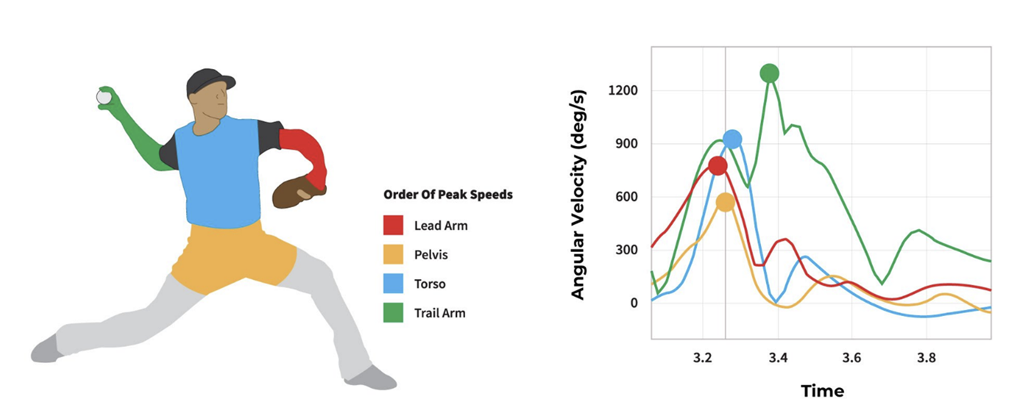- 하체에서 시작된 동작은 디딤 다리(우투수 기준 왼쪽 다리)의 착지 이후 신체의 중심인 골반/몸통의 움직임에 영향을 준다. 이러한 움직임은 다시 어깨, 팔꿈치, 손목 등 신체의 말단에 전이된다.