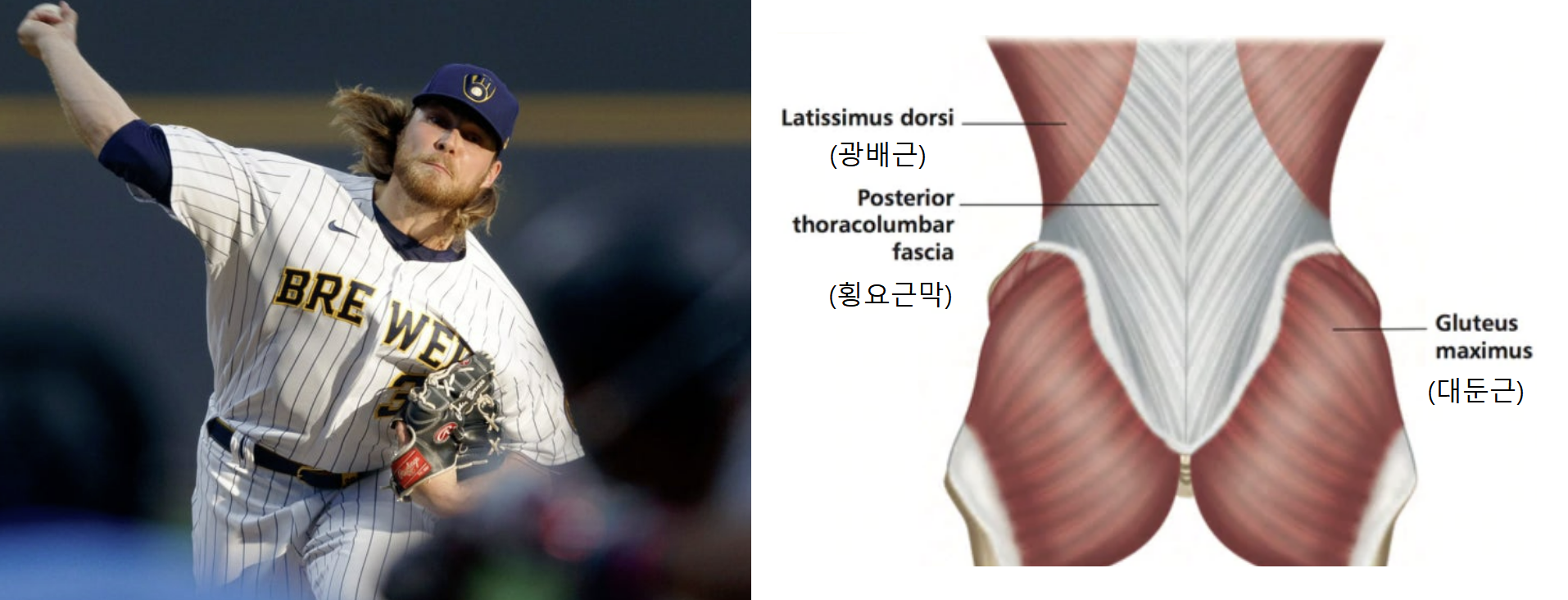 < 몸통이 앞으로 쏠리며 하체에서 상체로 에너지가 전이되는 모습(왼쪽)과 이 과정에서 주로 작용하는 근육/근육을 둘러싼 근막(오른쪽) >