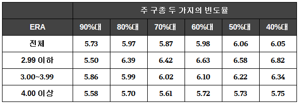 두 구종을 가장 높은 비율(90%대)로 구사하는, 이른바 투피치 투수들은 평균적으로 모든 구간대에서 가장 적은 이닝을 소화했다. 반면, 4~5개의 구종을 던지는 60%대부터 40%대에 위치한 투수들은 이닝 소화능력이 상대적으로 뛰어난 경향성이 있다고 해석할 수 있을 것같다. 특히 ERA 3.99이하의 ‘준수한’ 성적을 보여준 투수들의 경우에는 이 경향성이 ‘매우 짙다’고 말할 수 있겠다.