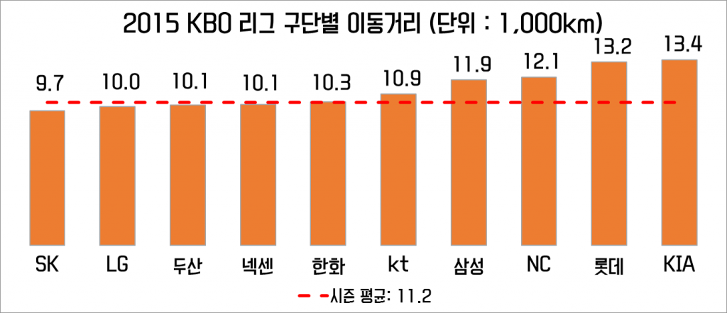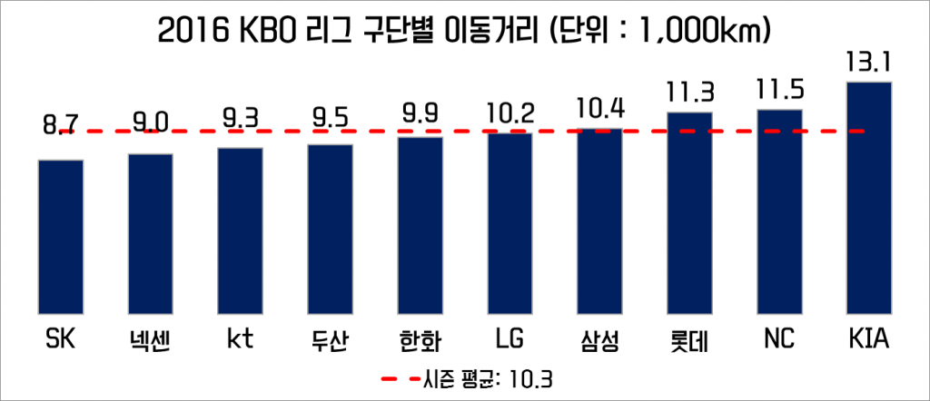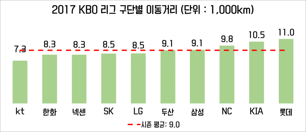 항공편으로 이동을 하는 MLB와 달리 KBO 리그는 구단버스로 이동을 한다. 구단별 이동거리는 NAVER 지도 기준 실시간 도로 교통 상황을 배제하고 각 구장과 구장 간 거리를 계산하였다. 올 시즌 넥센이 목동구장에서 고척스카이돔, 삼성이 대구시민구장에서 대구라이온즈파크로 구장을 이전함에 따라 이동 거리에도 약간의 변화를 동반했다. 여기에 청주, 포항, 울산에 제2구장 역시 이동거리에 영향을 미치는 변수로 작용하였다.