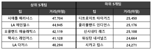 <2016 MLB 구단별 예상 이동거리 (상하위 5팀)>