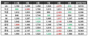MLB에 비해 구단의 분포 면적이 훨씬 작고 구단 수 및 경기수 역시 적은 KBO 리그의 경우는 어떨까.