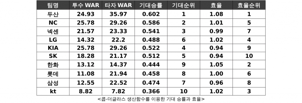 콥-더글라스 생산함수를 통해 산출된 기대 승률 역시 WAR에 기반한 기대 승률과 현격한 차이를 보이지는 않았다. 역시 대체로 WAR이 높은 팀이 높은 기대 승률을, WAR이 낮은 팀이 낮은 기대 승률을 기록했다. 그러나 전력에 비해 얼마나 높은 승률을 기록했는지를 보여주는 효율성 측면에서는 다소 차이가 나타났다.