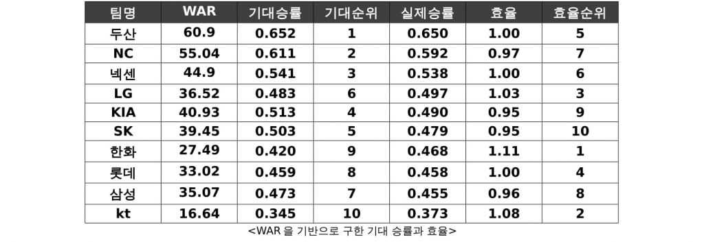WAR 기반의 효율성에서 1, 2위를 차지했던 한화와 kt는 이번에도 효율성면에서 2, 3위를 기록하며 전력에 비해 우수한 성적을 거두었음을 재차 확인시켰다. 반면 KIA와 SK는 여전히 9위와 10위에 머무르면서 또 한 번 전력에 비해 아쉬운 시즌을 보낸 것으로 나타났다.