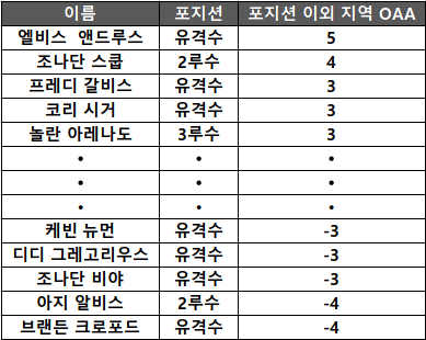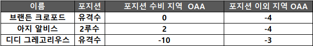 그러나 그레고리우스의 경우는 다르다. 시프트 비중이 줄어든다 해도 원래 포지션에서의 수비도 좋지 않기 때문에 여전히 낮은 OAA를 기록할 것이다. 이처럼 해당 포지션 OAA, 포지션 이외 지역 OAA에 따라 다른 해석이 가능해진다.