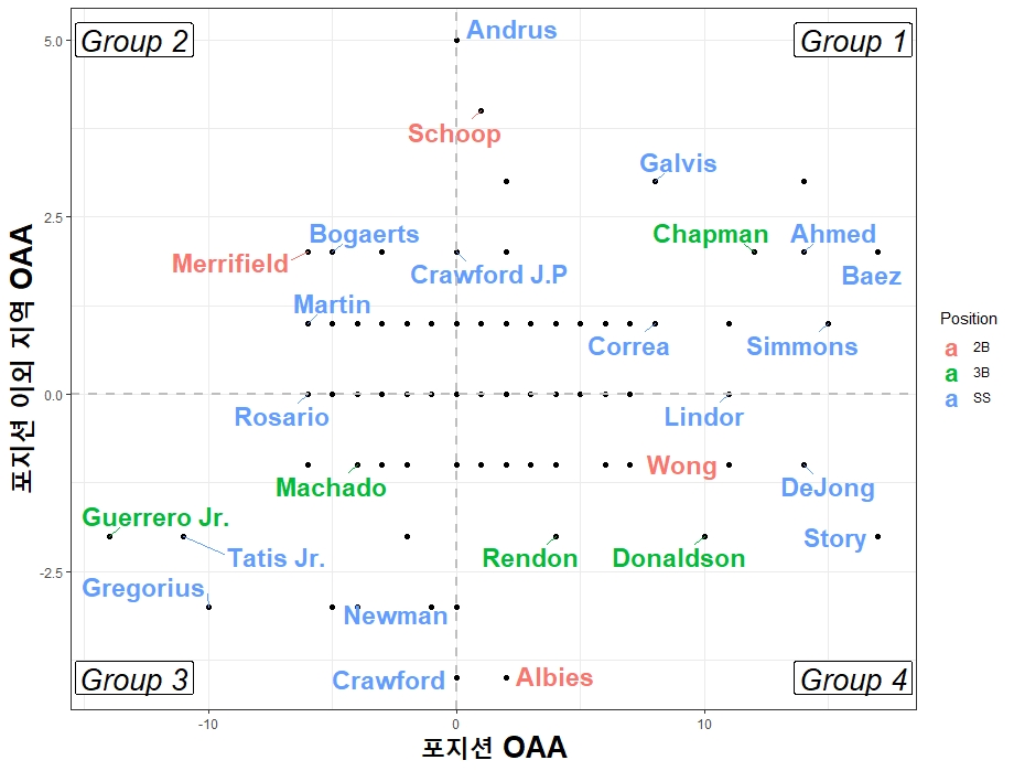 위 그림의 가로축은 포지션별 담당 수비 지역에서만 기록한 OAA 성적이다. 즉 유격수는 유격수 위치에서, 3루수는 3루수 지역에서 수비했을 때 기록한 값이다. 반대로 세로축은 포지션 이외의 지역에서 기록한 OAA 성적이다. 그리고 0을 중심으로 선수들을 그룹 1~4로 나누었다.