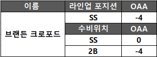 그렇다면 시프트로 다른 지역에서 수비해 포지션 기록에 손해를 본 경우, 시프트 비중이 줄어들면 OAA 성적이 상승할까? 100% 확답할 수는 없다. 크로포드나 알비스는 시프트 비중이 줄어든다면 OAA 성적 상승을 기대할 만하다. 이들은 포지션 이외 지역에서만 수비에 어려움을 겪을 뿐 원래 포지션에서는 좋은 수비를 보여줬기 때문이다.