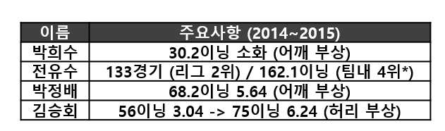 하지만 SK에는 시즌 후반 어느 정도 안정감을 갖추고 8회를 맡아주었던 서진용, 롱릴리프로서 잠재력을 보여준 정영일, 그리고 새로 합류한 해외파 유턴 선수들까지 여러 불펜 자원들이 가능성을 뽐내고 있다. 이들의 활약에 따라 내년 시즌 마운드 구상이 더 다양해질 수 있을 것이다. 이미 앞에서 언급한 박희수를 받쳐주는 2인방은 수준급의 필승조를 구축하고 있다. 이제 이들을 받쳐줄 제2의 2인방, 혹은 그 이상이 새롭게 두각을 드러내야 할 때다.