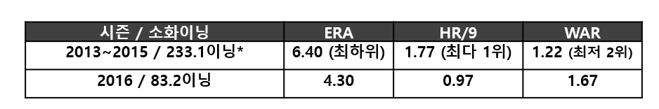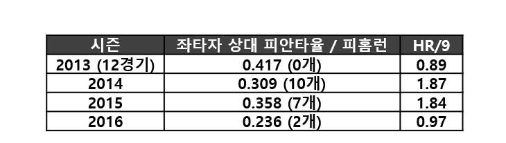 좋은 성적을 거두기는 했지만, 30대 중반에 접어드는 나이에 중간계투로서 많은 이닝을 투구했다는 사실은 분명 우려할 만한 대목이다(68경기 83.2이닝 / 최다등판 5위, 구원 이닝 4위). 또한 전 시즌에 비해 7푼가량 낮은 BABIP를 기록했다는 점(0.360->0.291)을 감안하면 2016년의 성적은 어느 정도 운이 따른 결과였다고도 해석해볼 수 있다. 단순한 운의 작용으로만 취급하기에는 투구에 나름의 변화를 주었던 것도 사실인 만큼, 2017년의 활약을 보다 차분하게 지켜볼 필요가 있을 것이다.