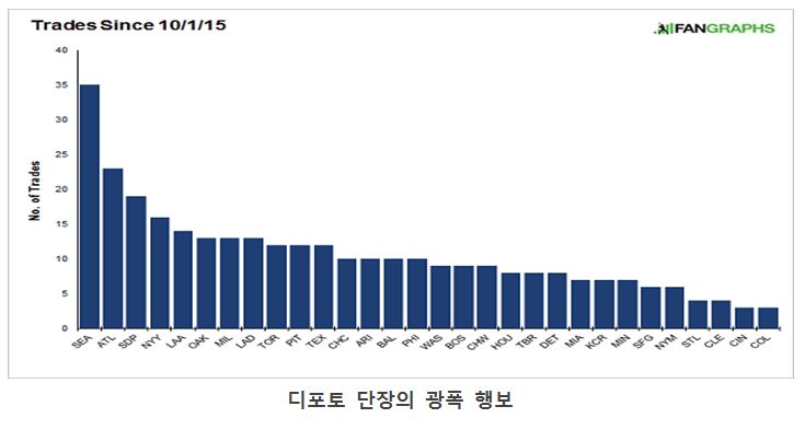 디포토 단장은 시애틀 부임 후 올해 1월 11일(이하 현지 시간)까지 무려 35건의 트레이드를 성사시켰다. 이는 애초 방향을 리빌딩으로 잡은 애틀랜타 브레이브스(23건)보다 12건이나 많고 A.J. 프렐러 단장(그는 이틀간 5건의 트레이드를 성사시켜 ‘매드맨’이라는 별명을 얻었다.)이 이끄는 샌디에이고 파드레스(19건)의 약 2배에 달하는 파격적인 행보다. 아직 스토브 리그가 끝나지 않은 가운데 시애틀은 올 겨울에도 이미 11차례의 트레이드를 완료했다. 여기에 FA 계약과 마이너 계약까지 포함하면 약 2달 사이에 트레이드 상대팀 포함 30명이 넘는 선수가 유니폼을 갈아입었다.