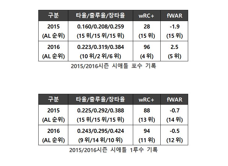 2015시즌 시애틀은 76승 86패(승률 0.469)로 아메리칸리그(AL) 서부지구 4위에 머물렀다. AL 팀타율(0.249), 득점(656개) 모두 13위를 기록한 빈약한 공격력의 가장 큰 책임은 포수와 1루수 포지션에 있었다.