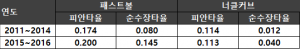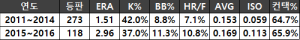 2011~2014(좌), 2015~2016(우)년 킴브렐의좌타자 상대 패스트볼 코스 비율