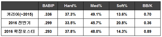 지난 시즌, 매커친의 타격 지표는 HR/FB%를 제외한 모든 영역에서 확연하게 내리막을 걸었다. 특히, BABIP의 낙폭은 눈에 띄는 수준이었다.