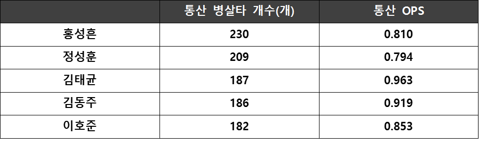 하지만 많은 병살타 개수가 팀 입장에서나 타자 입장에서나 꼭 불명예스러운 것만은 아니다. 많은 병살타를 기록하기 위해서는 많은 병살타 상황, 즉 1루를 포함한 1명의 이상의 주자가 있는 경우여야 하고 연속한 수비가 가능하도록 타구 속도가 빨라야 한다. 그래서 특정 타자가 많은 병살타를 기록했다는 것은 팀에서 그 선수 앞에 자주 밥상을 차려주었다는 의미이기도 하고 타자가 잘맞은, 속도가 빠른 타구를 자주 만들어냈다는 것도 의미한다. 그래서 통산 병살타 순위에서 상위에 오른 선수들은 팀에서 타점을 기대하는 ‘뛰어난 타자’라고도 볼 수 있다. 한 시대를 풍미했던 강타자들이 병살타 순위에 이름을 올리고 있는 이유다.
