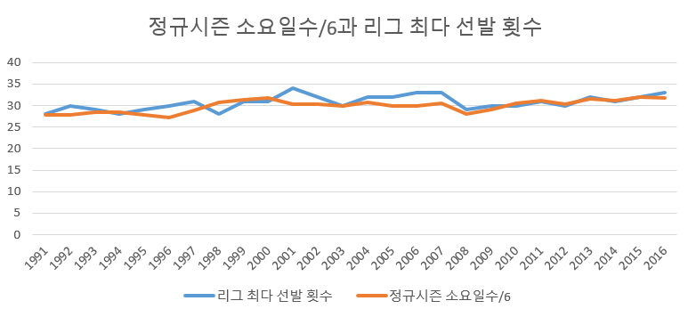 위 그래프는 연도별로 리그 최다 선발 등판 횟수와 정규시즌 소요일수를 6으로 나눈 값을 나타낸 것이다. 선발 분업화나 5일 휴식 등판이 완전히 정착되지 않은 2000년대 초반까지는 둘 사이에 오차가 있지만 2000년대 후반부터는 거의 일치하는 것을 볼 수 있다. 선발투수의 등판 정도를 평가함에 있어 팀 총 경기수보다 정규시즌 소요일수가 더 중요하다는 것을 알 수 있는 부분이다.