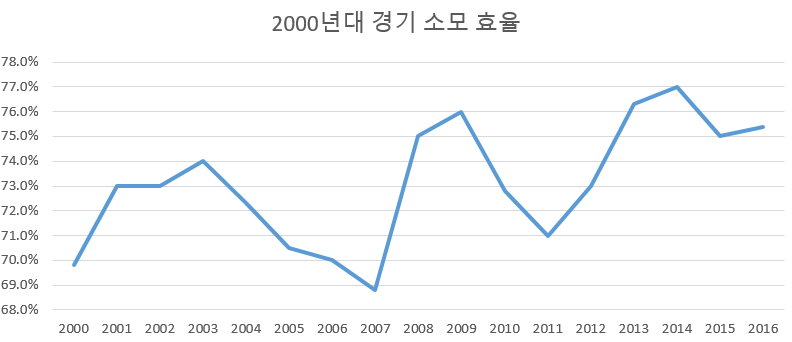 위 그래프는 2000년대 이후 연도별 경기 소모 효율을 나타낸 것이다. 9개 구단이 된 2013년에 76.3%로 높아졌고 이후로 계속 75.0% 이상의 높은 효율을 보이는 것을 확인할 수 있다. 전체로 비교하면 8개 구단 체제인 2000 ~ 2012년의 평균 경기 소모 효율은 72.2%인 반면 2013년 이후의 경기 소모 효율은 75.9%다. 3.7%P의 차이가 그리 크지 않아 보일 수도 있지만 3.7%가 약 180일 가량 누적되면 일주일 정도의 일정 차이가 생긴다. 이를 시즌을 일찍 시작함으로써 확보한 1주일과 합하면 약 2주일. 11경기를 추가로 소모하기에 충분한 시간이 된다.