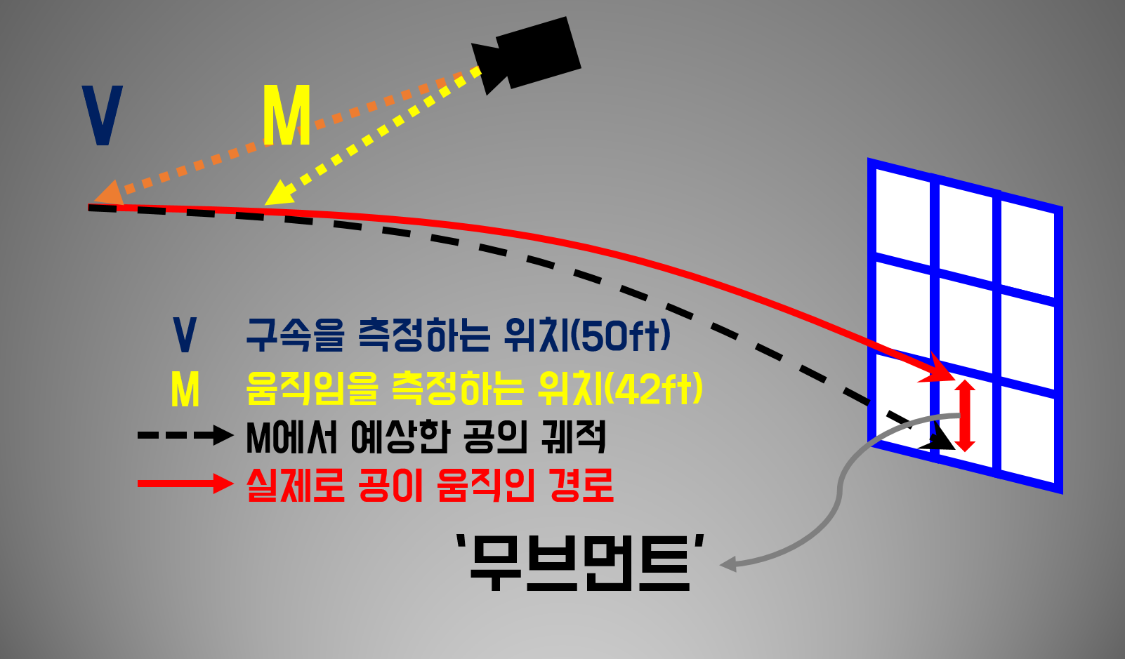 그동안 사용된 PITCH f/x 시스템은 홈플레이트에서 50피트 떨어진 곳에서 공의 빠르기를 처음 측정했다. 우리가 흔히 사용하는 ‘구속’ 또는 ‘초속’은 이 지점에서 측정된 공의 빠르기를 말한다. 또한 이보다 조금 앞, 42피트 지점에서 측정된 공의 궤적 및 이를 토대로 계산된 종착지와 실제 종착지의 차이가 공의 ‘무브먼트’ 값으로 계산된다. 변화구는 진행 도중 공기의 저항을 받아 더 크게 휘기 때문에 가상의 궤적과 실제 궤적의 차이가 더 크다.