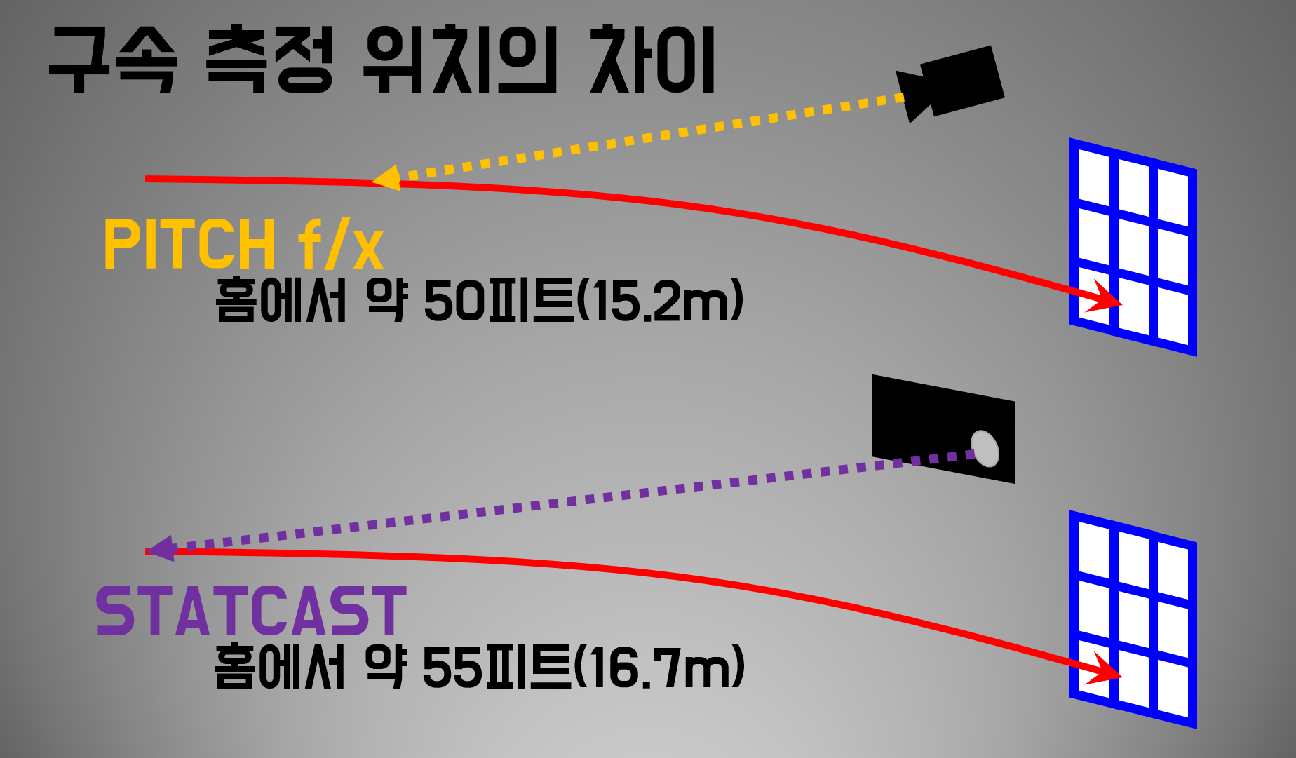이 5피트 정도의 차이는 투수의 구속 데이터에 상당한 차이를 불러온다. 5피트, 1.5미터 정도의 거리를 지나는 동안에도 투수가 던진 공은 시속 1마일 가까이 줄어든다. 달리 말해 PITCH f/x 시스템에 의해 50피트 지점에서 시속 92마일로 잡히던 공이 스탯캐스트 시스템에서는 55피트 지점에서 시속 93마일로 잡히는 것이다.