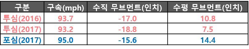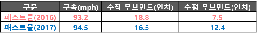 크리스 세일의 2016년 & 2017년 패스트볼 데이터.