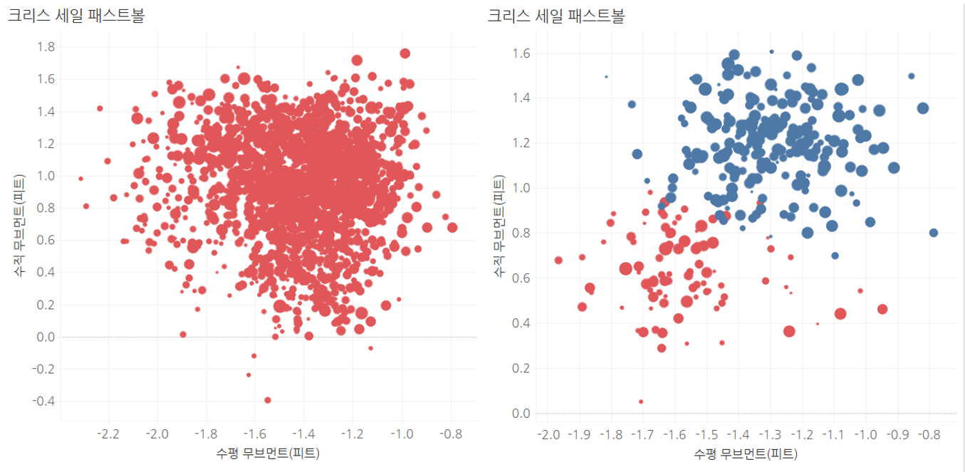 위 그림에서 왼쪽은 세일의 2016년 패스트볼을, 오른쪽은 2017년 패스트볼을 나타낸 차트다. 차트에서 붉은 색은 투심, 푸른 색은 포심이며 구속이 높을수록 점이 굵다. 2017년의 데이터를 보면 대체로 구속이 빠르고 수직 무브먼트가 1피트(12인치)를 넘기는 공들이 포심으로 분류되는 것을 알 수 있다. 여기까지만 보면 스탯캐스트의 분류 기준에 문제가 없어 보이며, 세일이 새로 포심 패스트볼을 던진다고 생각하게 된다.