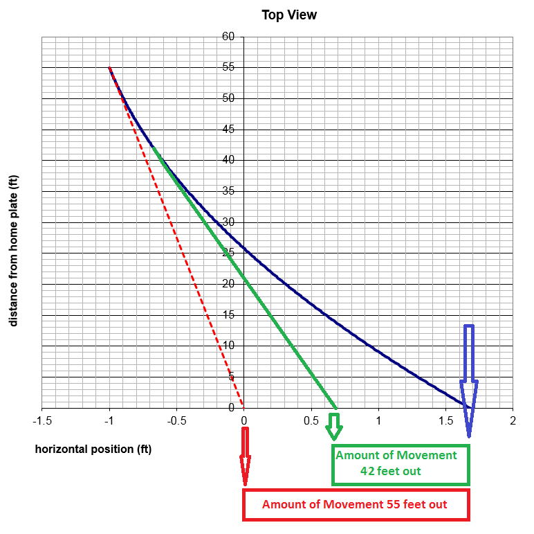 42피트 지점에서 측정한 예상 궤적(초록색), 55피트 지점에서 측정한 예상 궤적(붉은색), 실제 투구 궤적(파란색). (이미지=tangotier.com)
